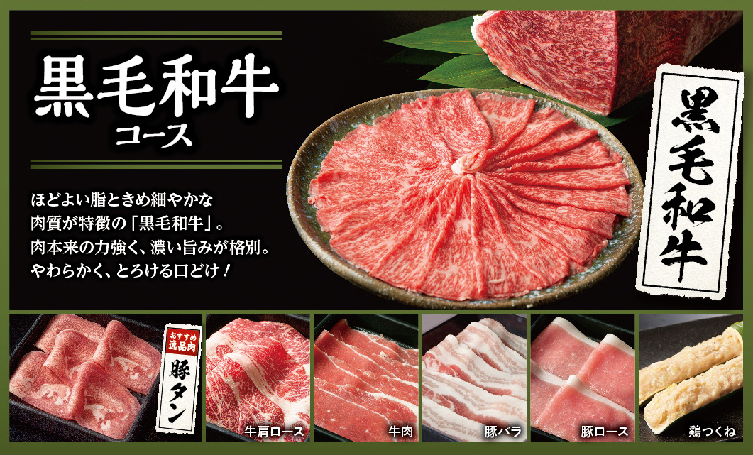 おかわり自由の牛肉や豚肉と、野菜バーから選べる新鮮野菜をお好きなだけ楽しめる「しゃぶしゃぶ」と「すきやき」が食べ放題のレストランです。
